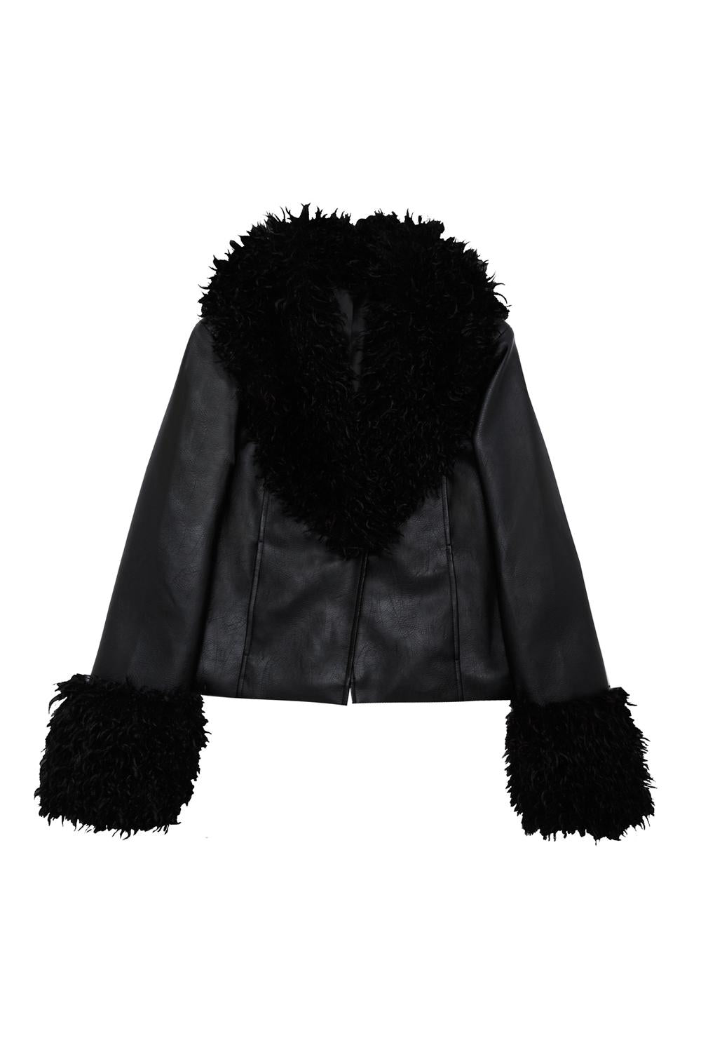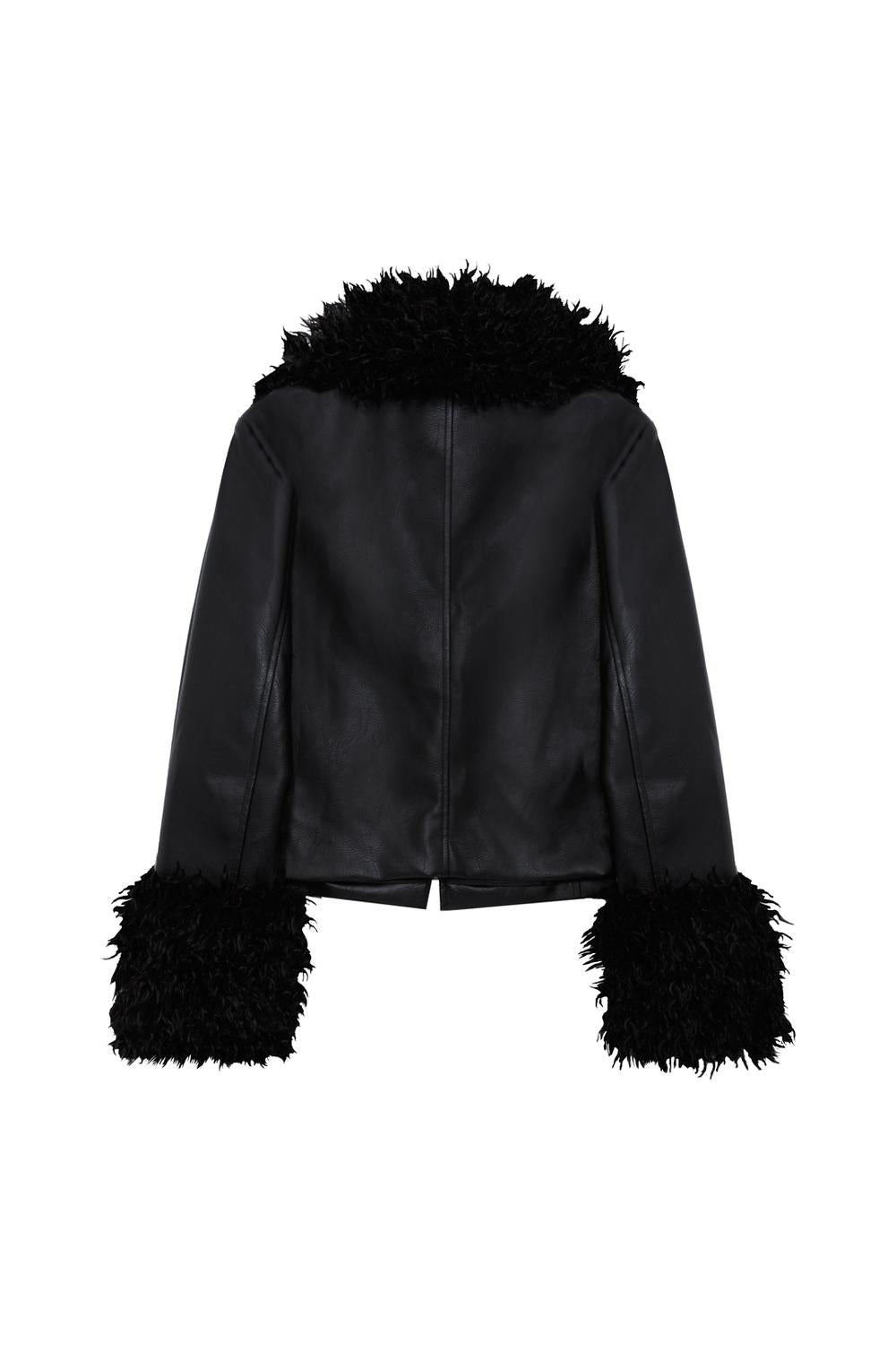 Chaqueta corta confeccionada en tejido efecto piel con textura suave. Diseño con cuello y puños anchos forrados en borreguito. Cierre frontal oculto y corte recto.