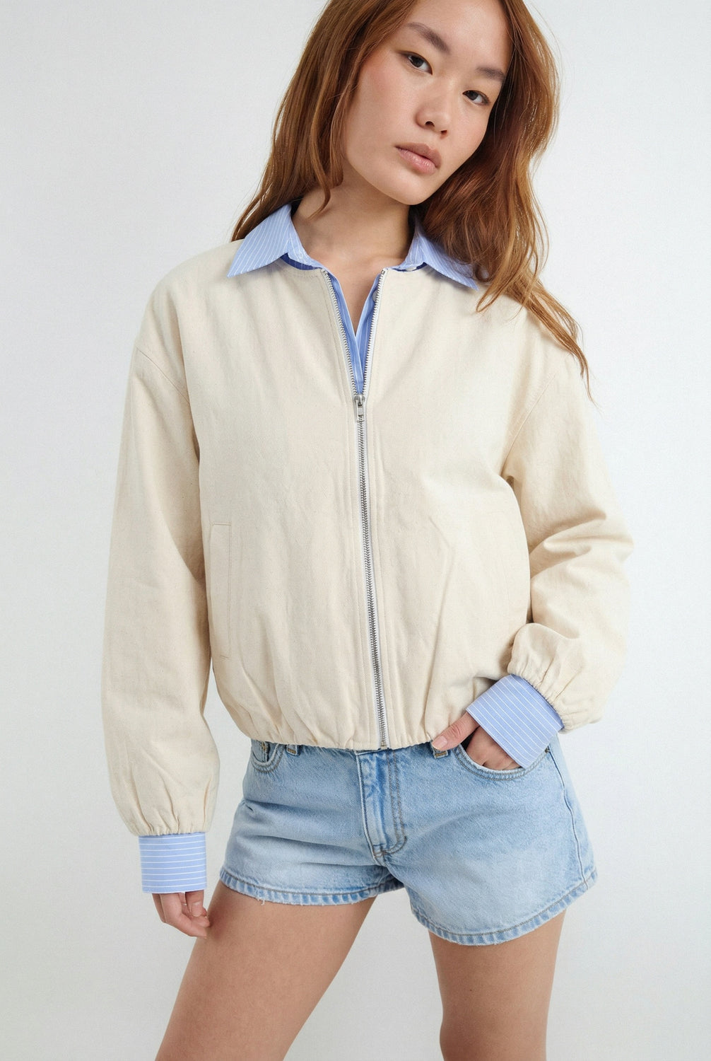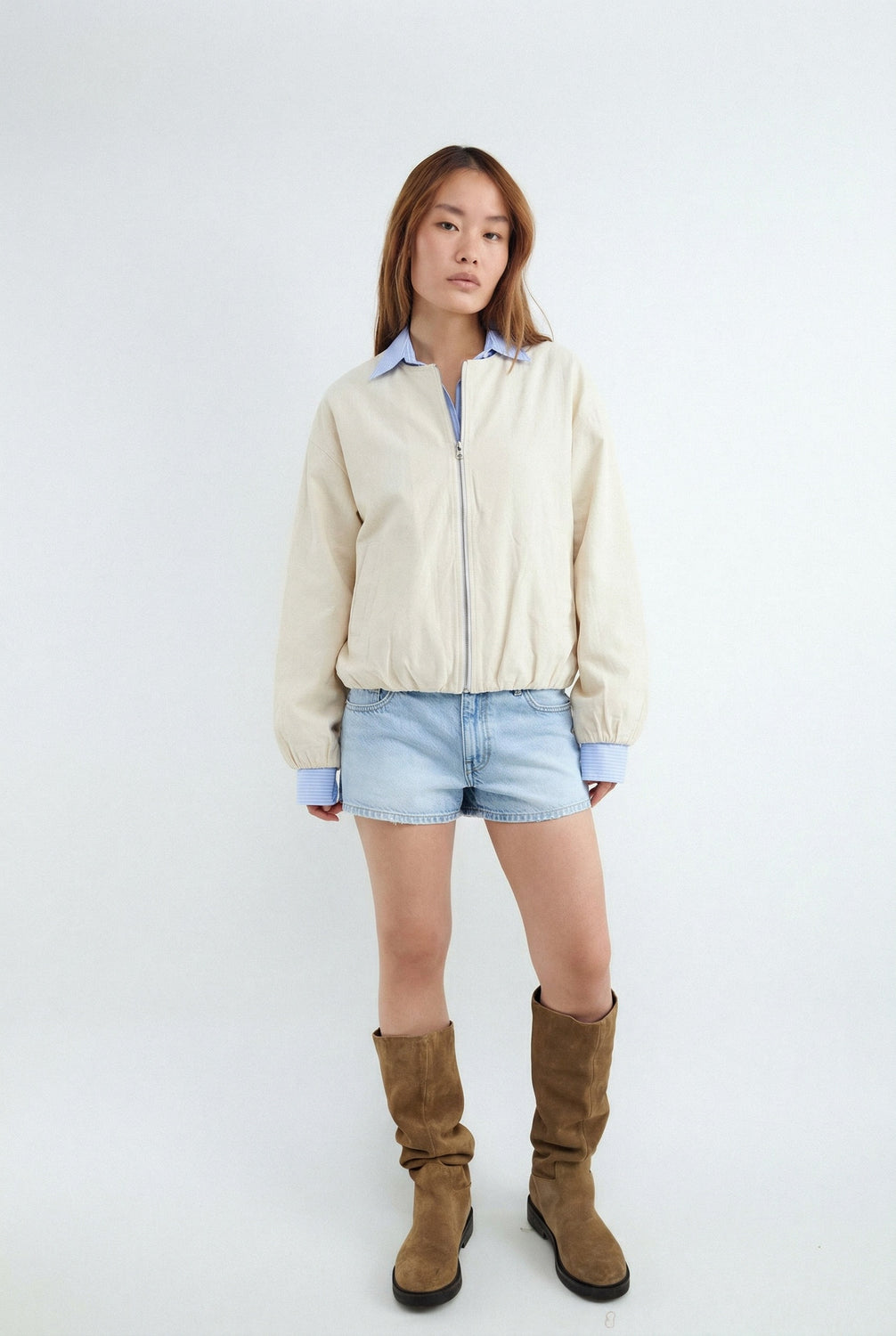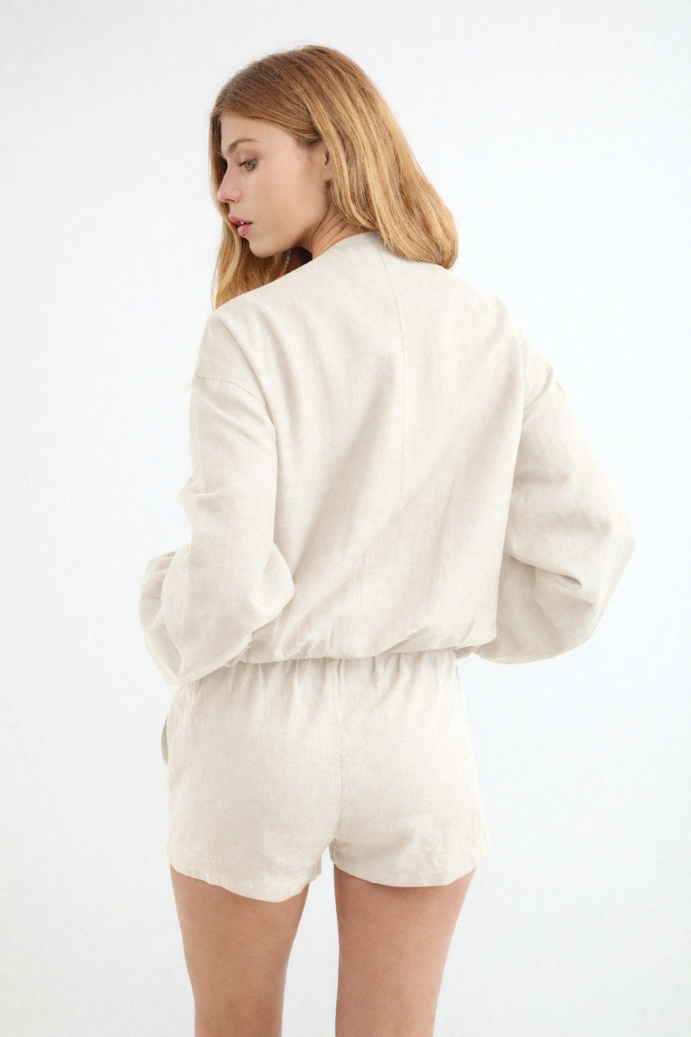 Bomber fluida con con cierre mediante cremallera frontal. Confeccionado en tejido mezcla de algodón y lino