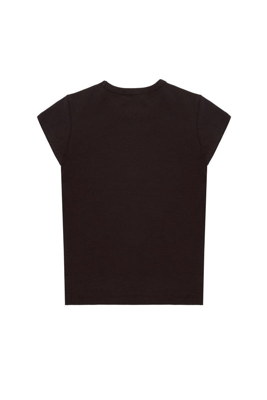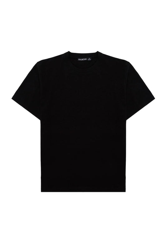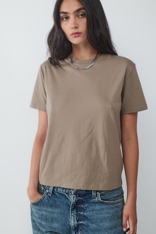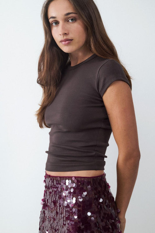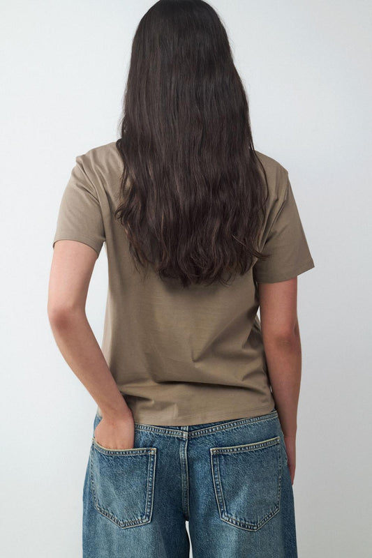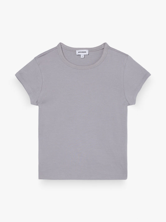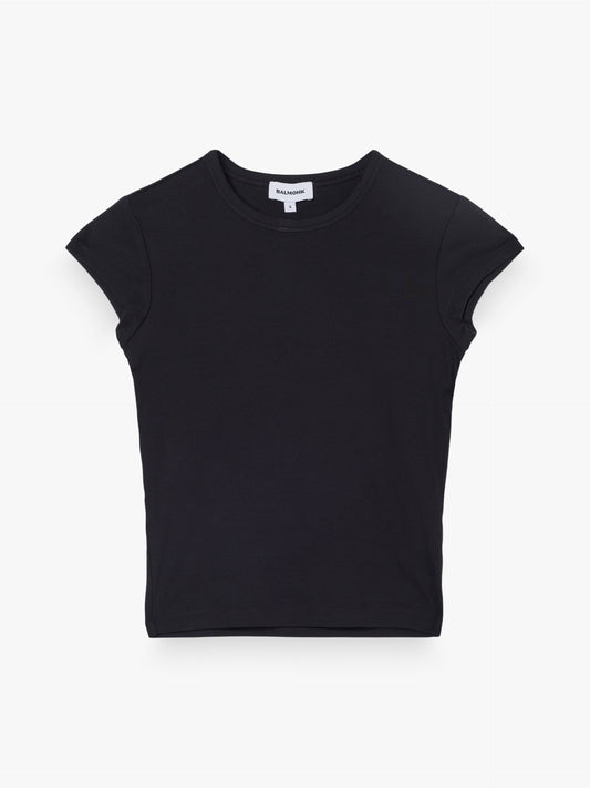 Basic fitted short-sleeved T-shirt made of stretch knit fabric. Round neckline and straight hem and sleeves.