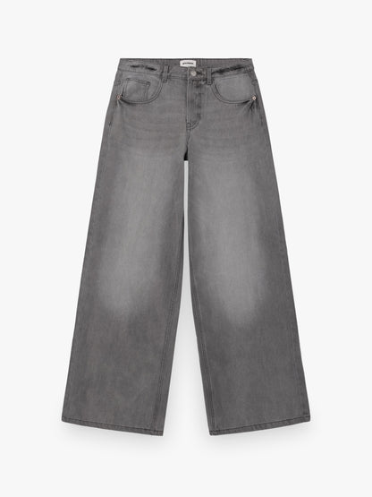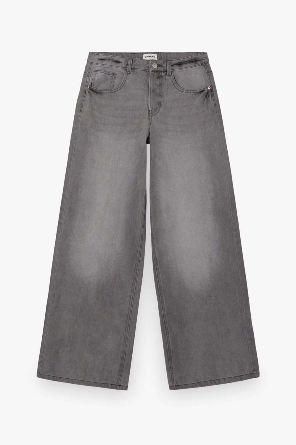 Jeans de tiro bajo. Diseño de pierna ancha desde la cadera hasta el bajo. Estilo de cinco bolsillos con cierre de cremallera y botón metálico. Este producto talla más grande de lo habitual.