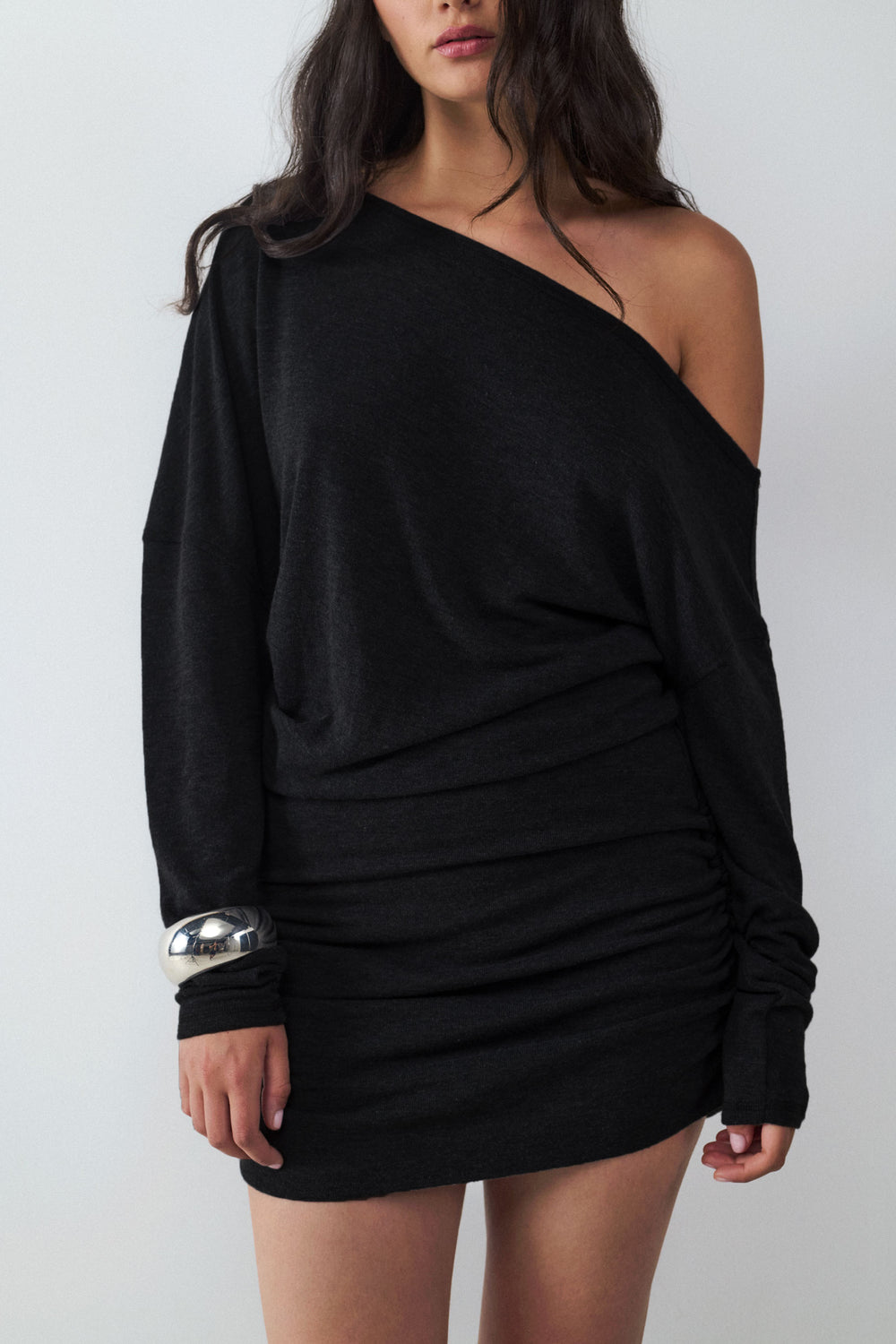 Vestido mini asimétrico de manga larga, confeccionado en tejido elástico. Presenta escote caído al hombro, ajuste entallado y fruncido lateral en la falda.
