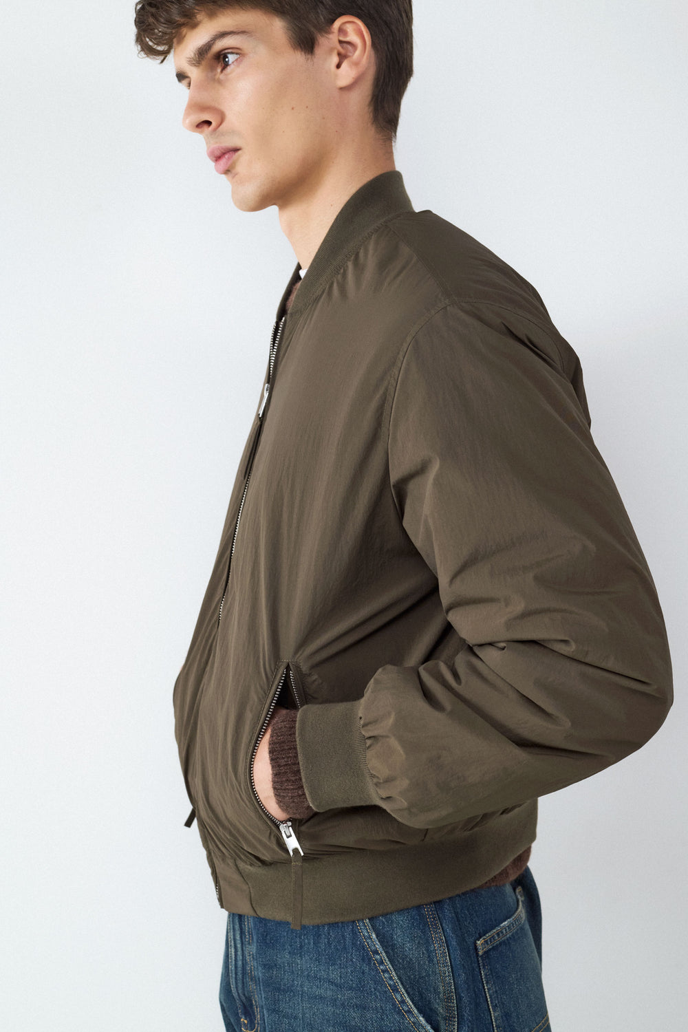 Cazadora bomber acolchada con diseño moderno y ligeramente corto. Cuenta con cierre frontal de cremallera, cuello redondo y bolsillos laterales funcionales. Acabado elástico en el bajo para un ajuste cómodo. Perfecta para entretiempo y estilo casual.