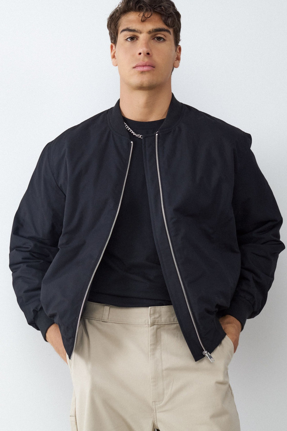 Chaqueta bomber confeccionada en mezcla de algodón, con cuello redondo y cierre frontal de cremallera metálica. Cuenta con bolsillos laterales y acabados elásticos en los puños para un ajuste cómodo. Ideal para un look urbano y casual con estilo moderno.