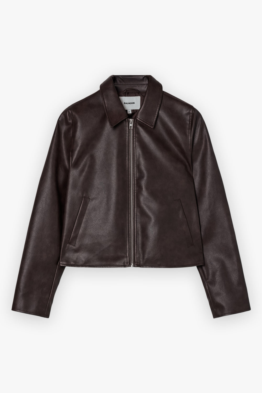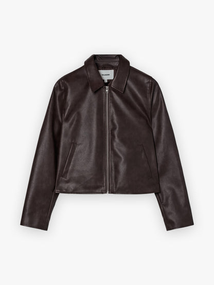 Chaqueta de manga larga confeccionada en tejido efecto cuero. Diseño con cuello clásico, cierre frontal con cremallera y bajo recto.