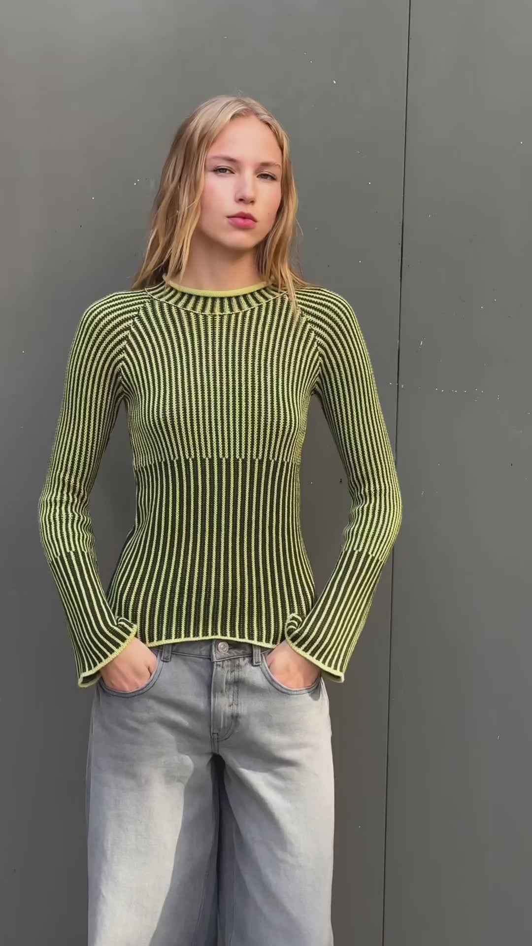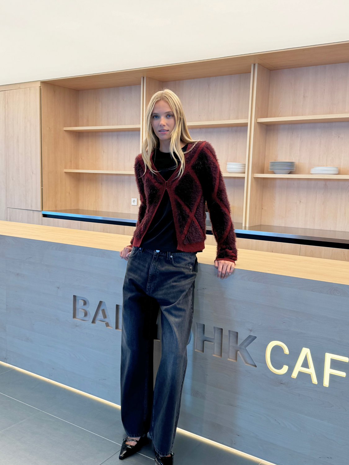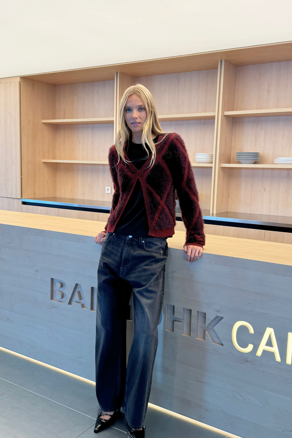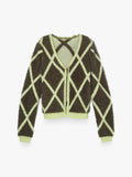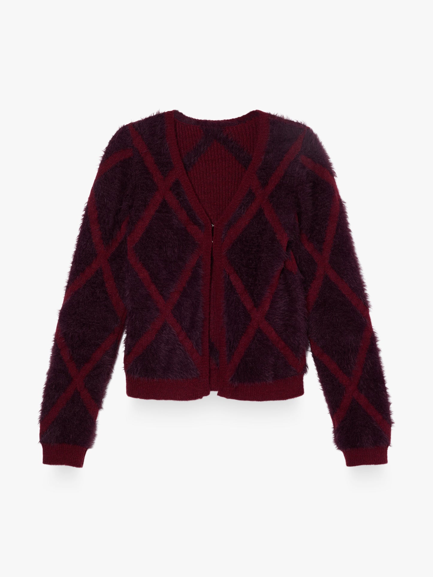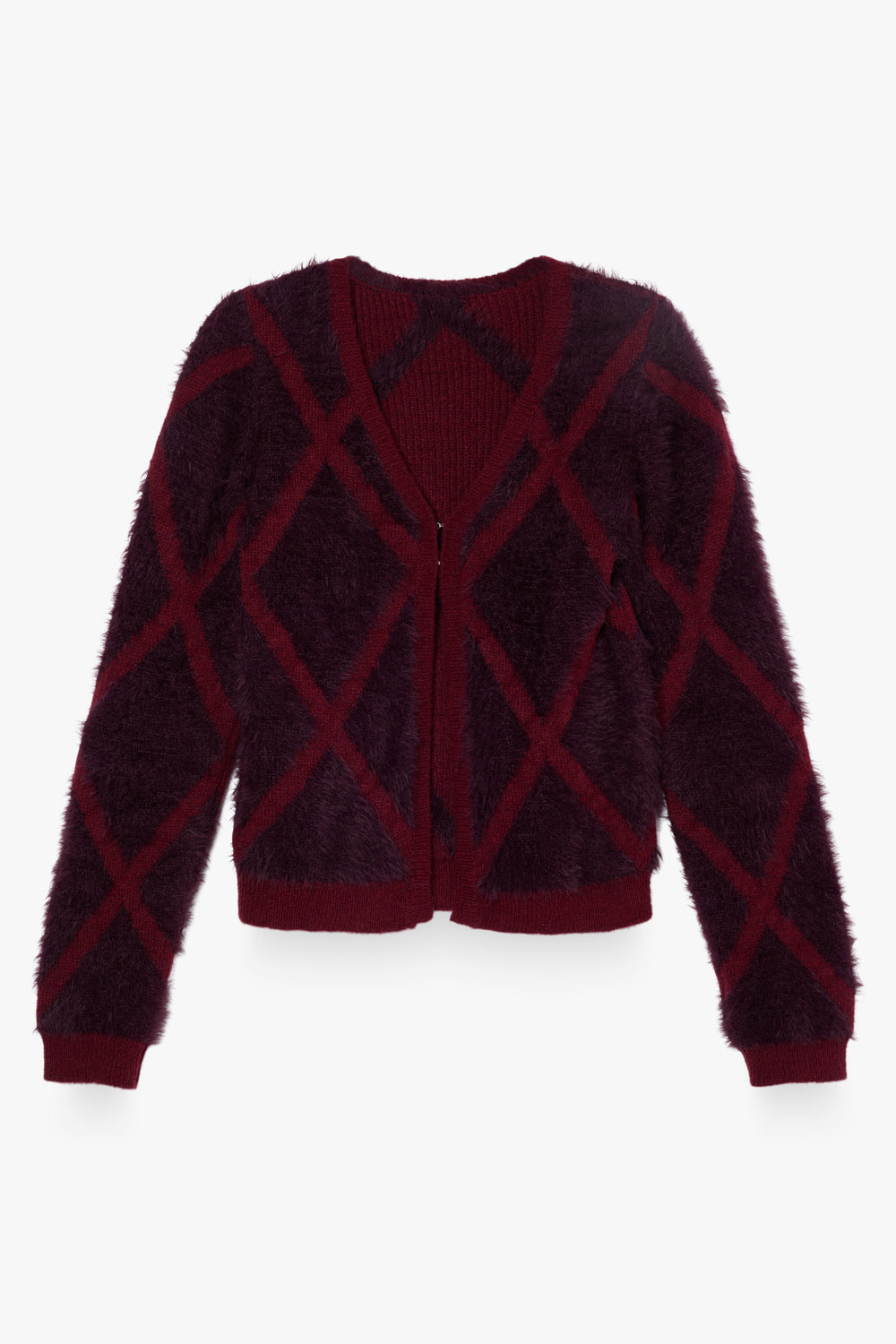 Cárdigan de punto con manga larga y escote en pico. Estampado de rombos en contraste y cierre frontal con botones.