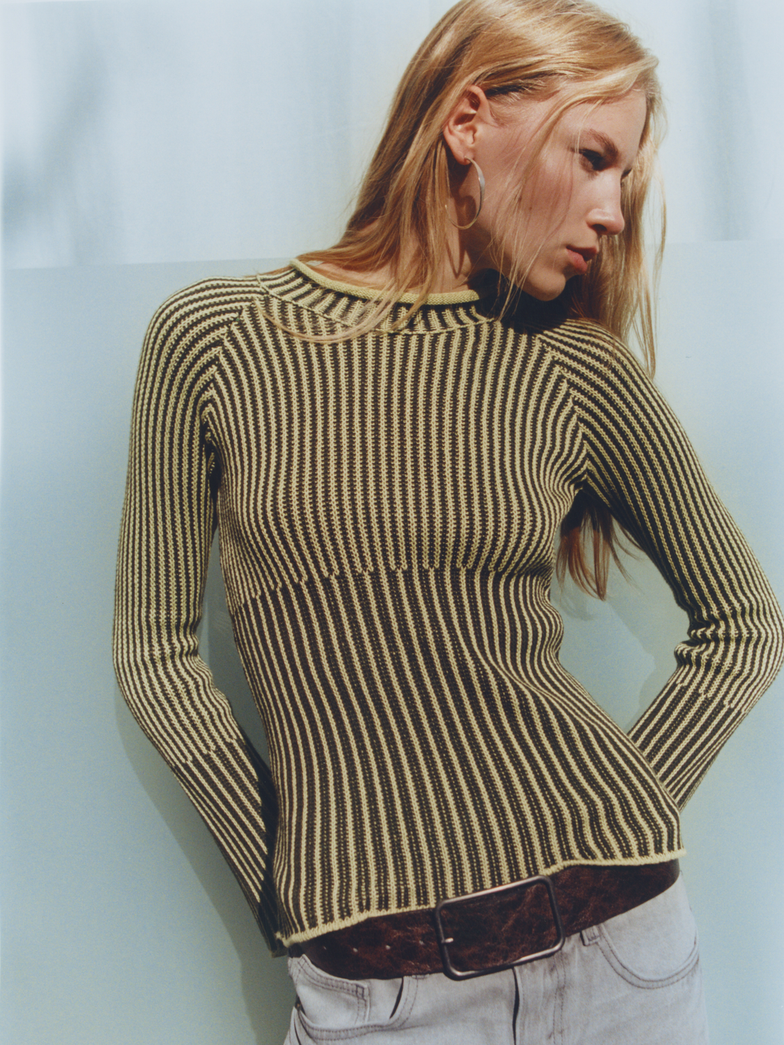 Jersey de punto con estampado de rayas en contraste. Presenta manga larga ligeramente acampanada, cuello redondo y bajo recto.