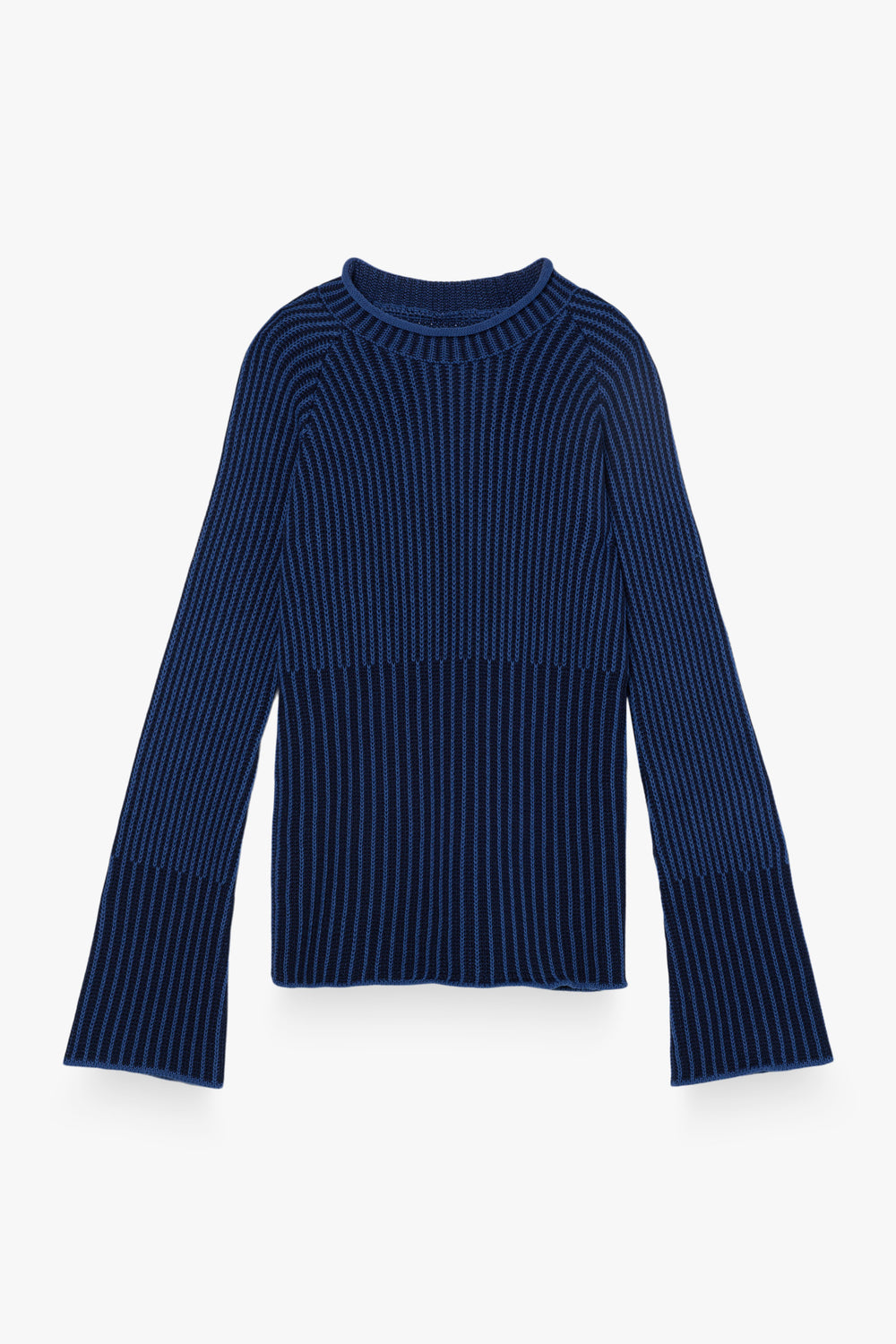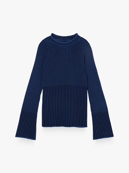 Jersey de punto con estampado de rayas en contraste. Presenta manga larga ligeramente acampanada, cuello redondo y bajo recto.