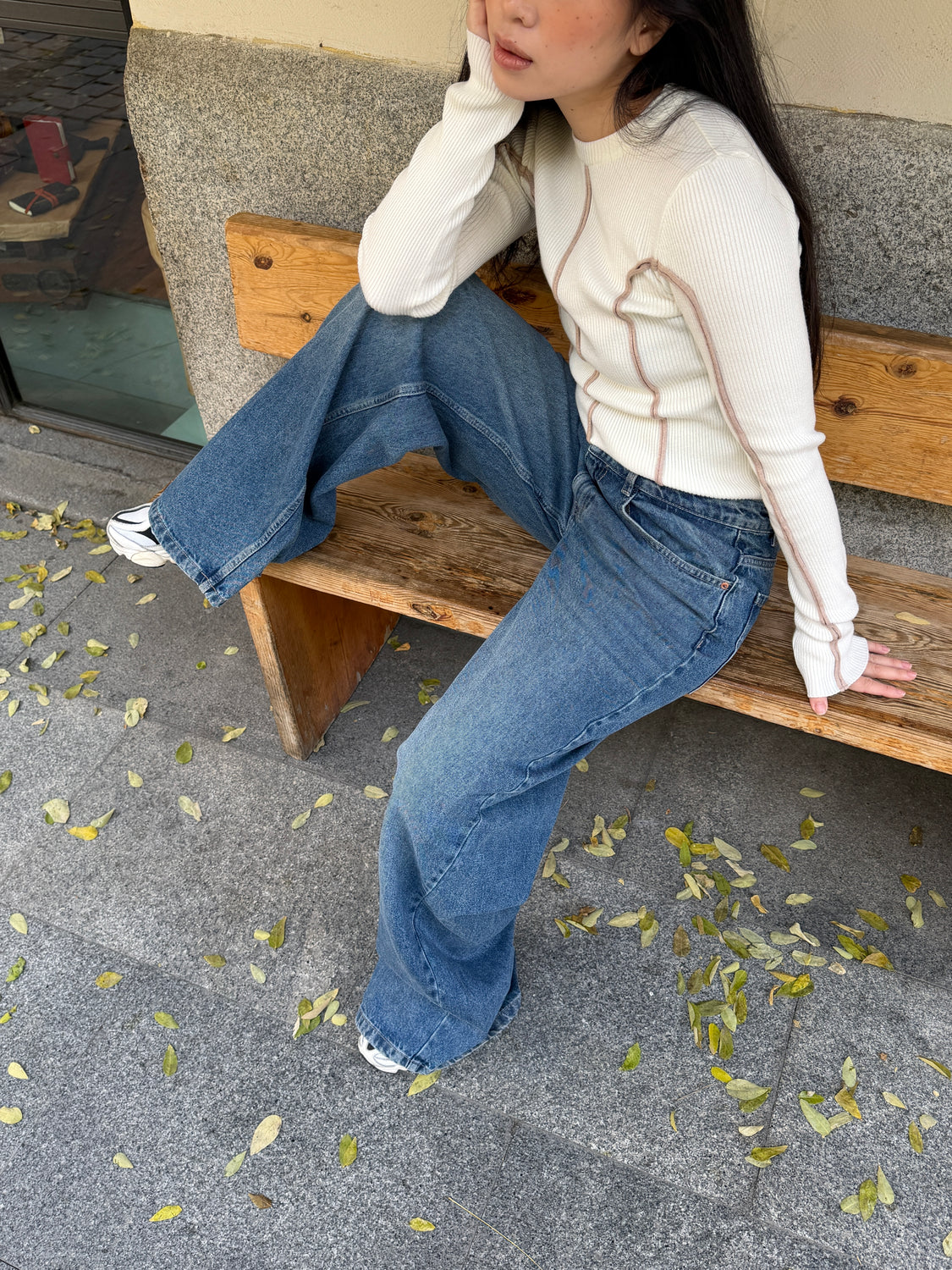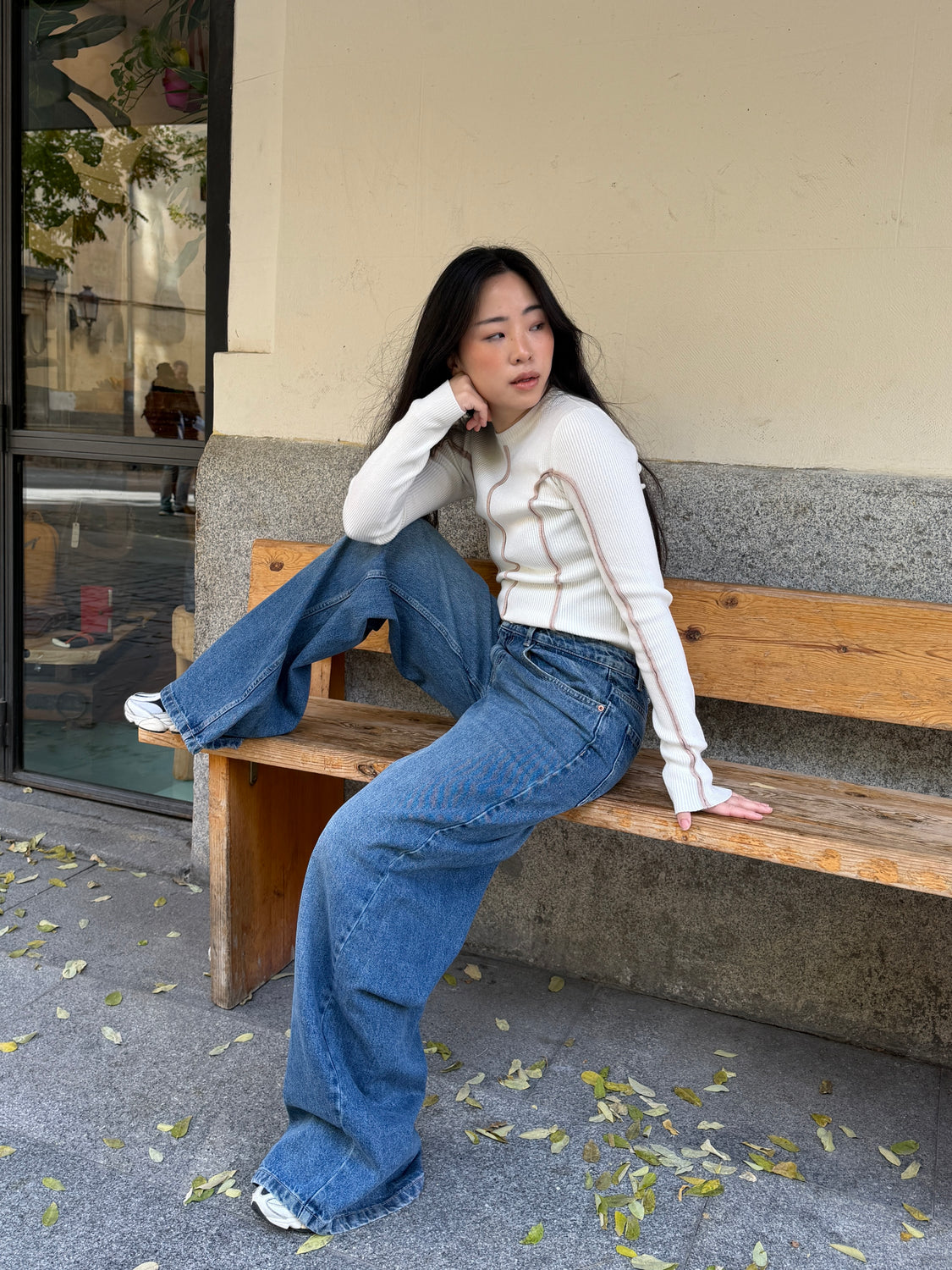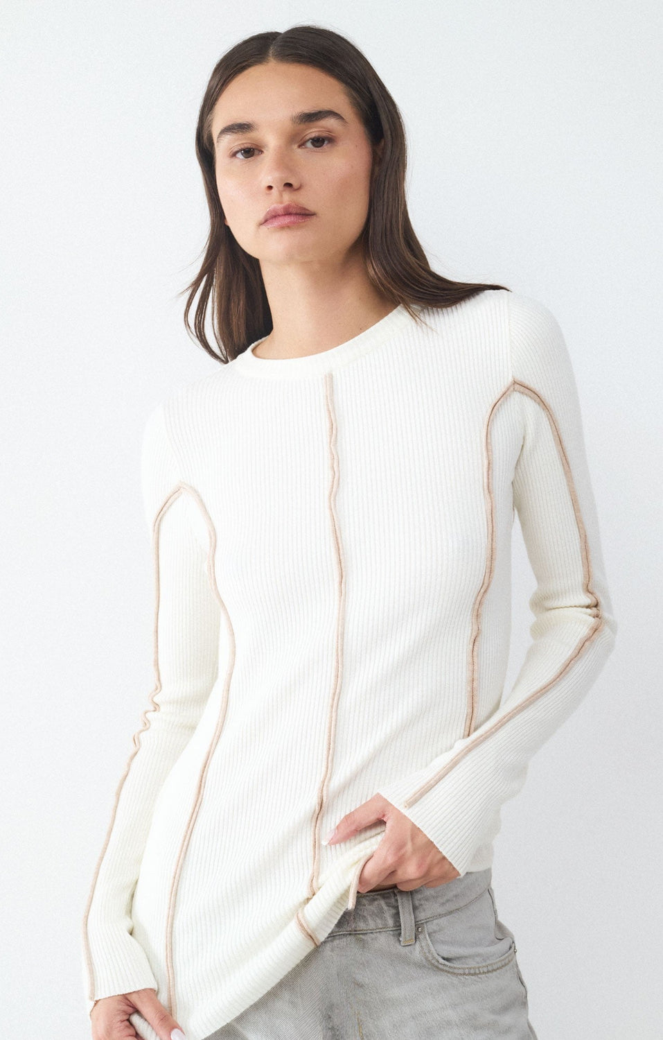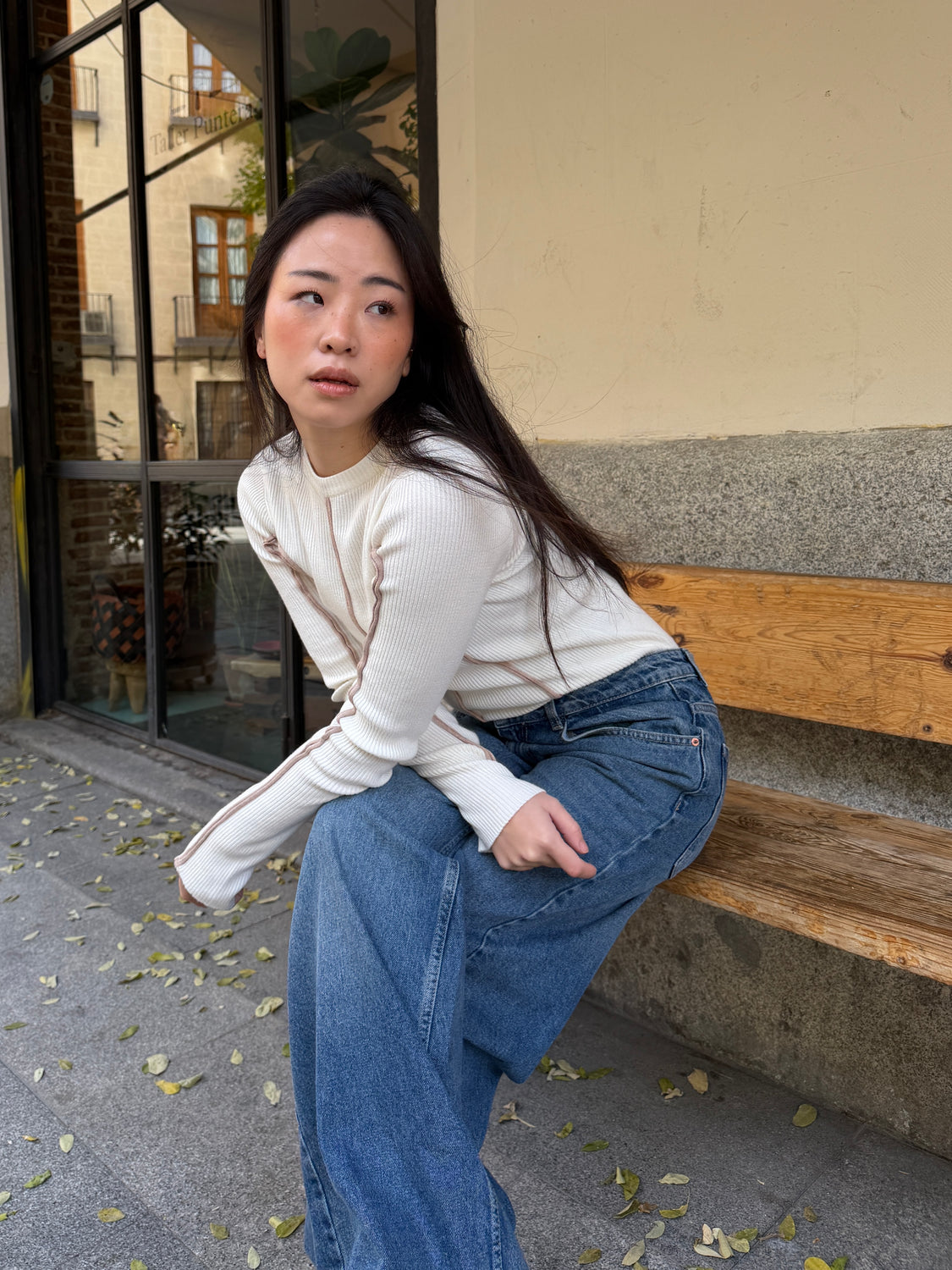 Jersey de manga larga confeccionado en punto canalé elástico. Diseño ajustado con cuello redondo y costuras decorativas en contraste en el delantero, la espalda y las mangas.