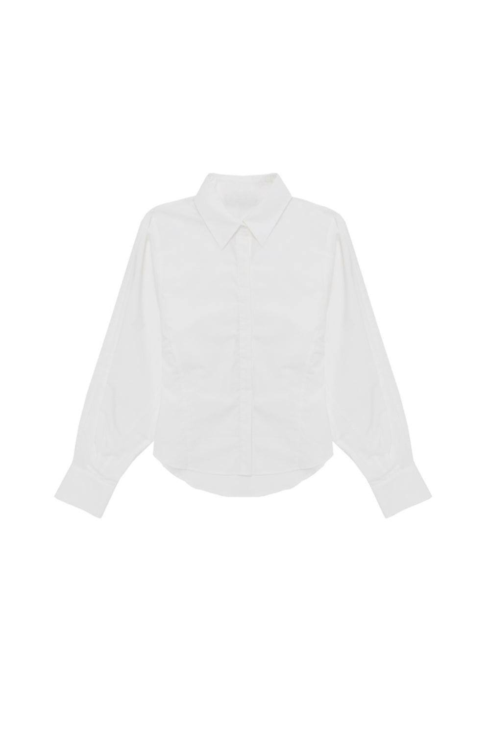 Camisa de manga larga confeccionada en popelina de algodón. Diseño de corte recto con cuello clásico, cierre frontal oculto y puños anchos con botón.