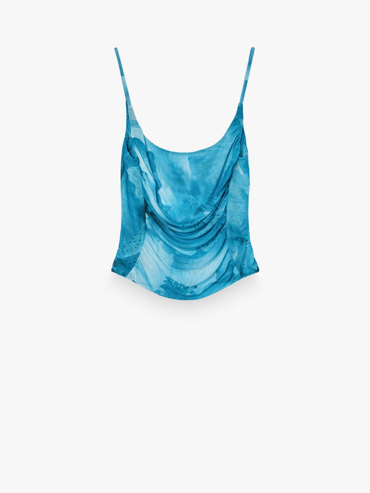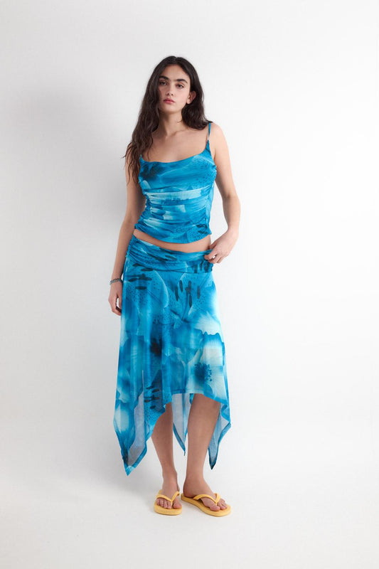 Falda midi de corte fluido con diseño asimétrico y detalle de fruncido drapeado en la cintura. Confeccionada en un tejido ligero con estampado floral en tonos azules.