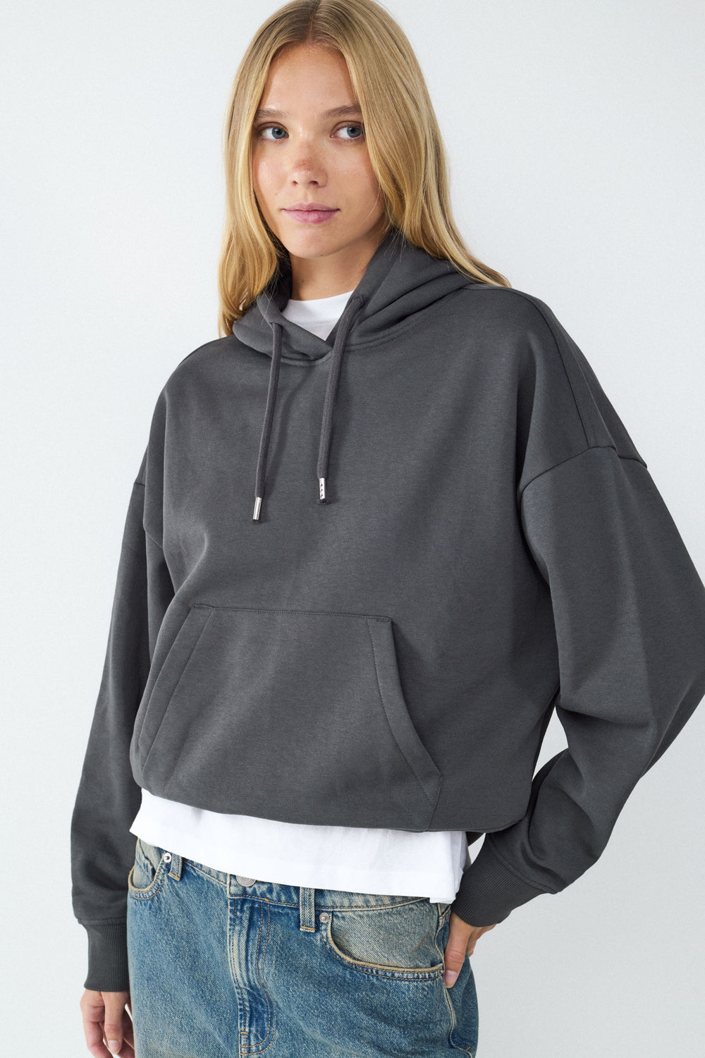 Sudadera con capucha ajustable mediante cordón, bolsillo canguro y manga larga. Puños y bajo acabados en canalé.