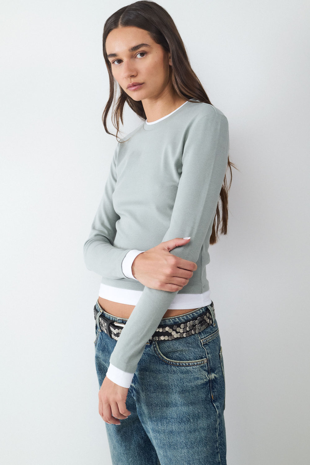 Camiseta de manga larga con efecto doble capa y cuello redondo a contraste.