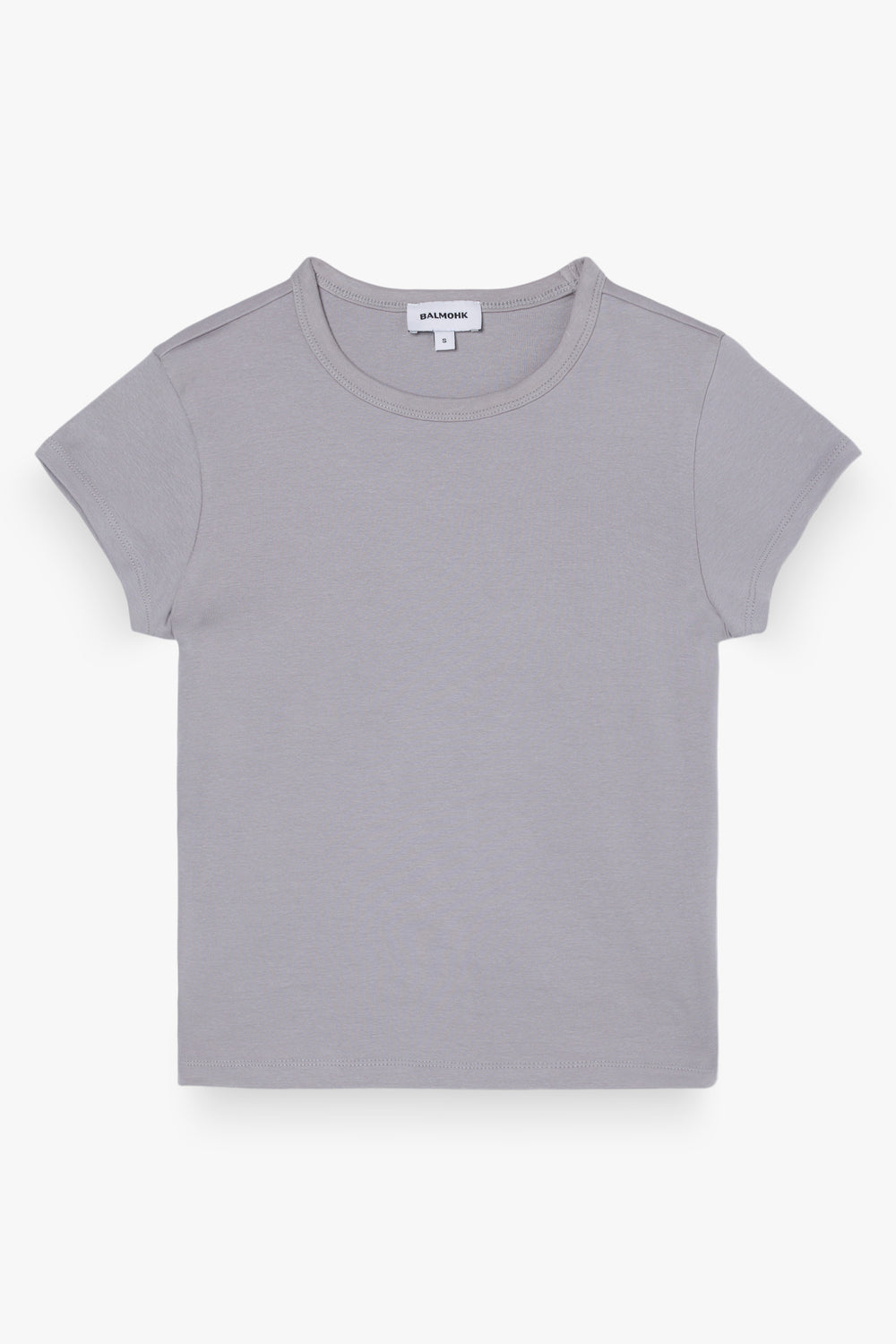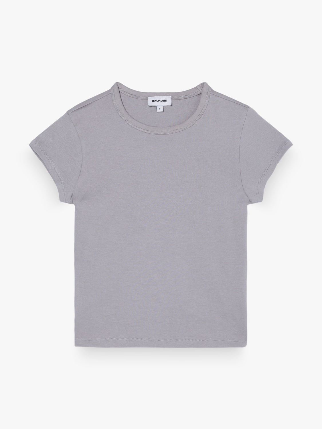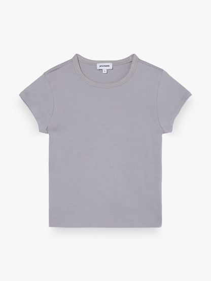 Camiseta básica entallada de manga corta, confeccionada en tejido elástico de punto. Cuello redondo y acabado recto en bajo y mangas.