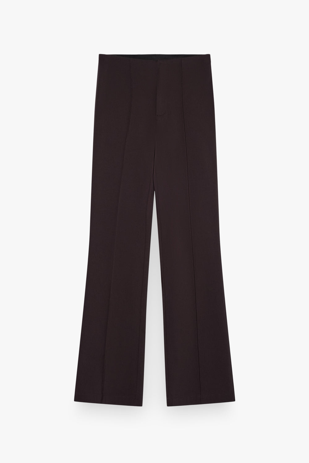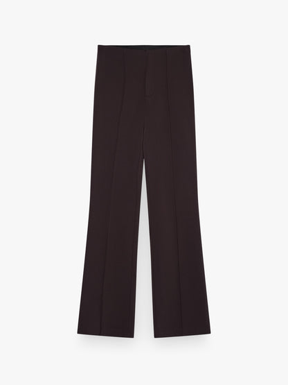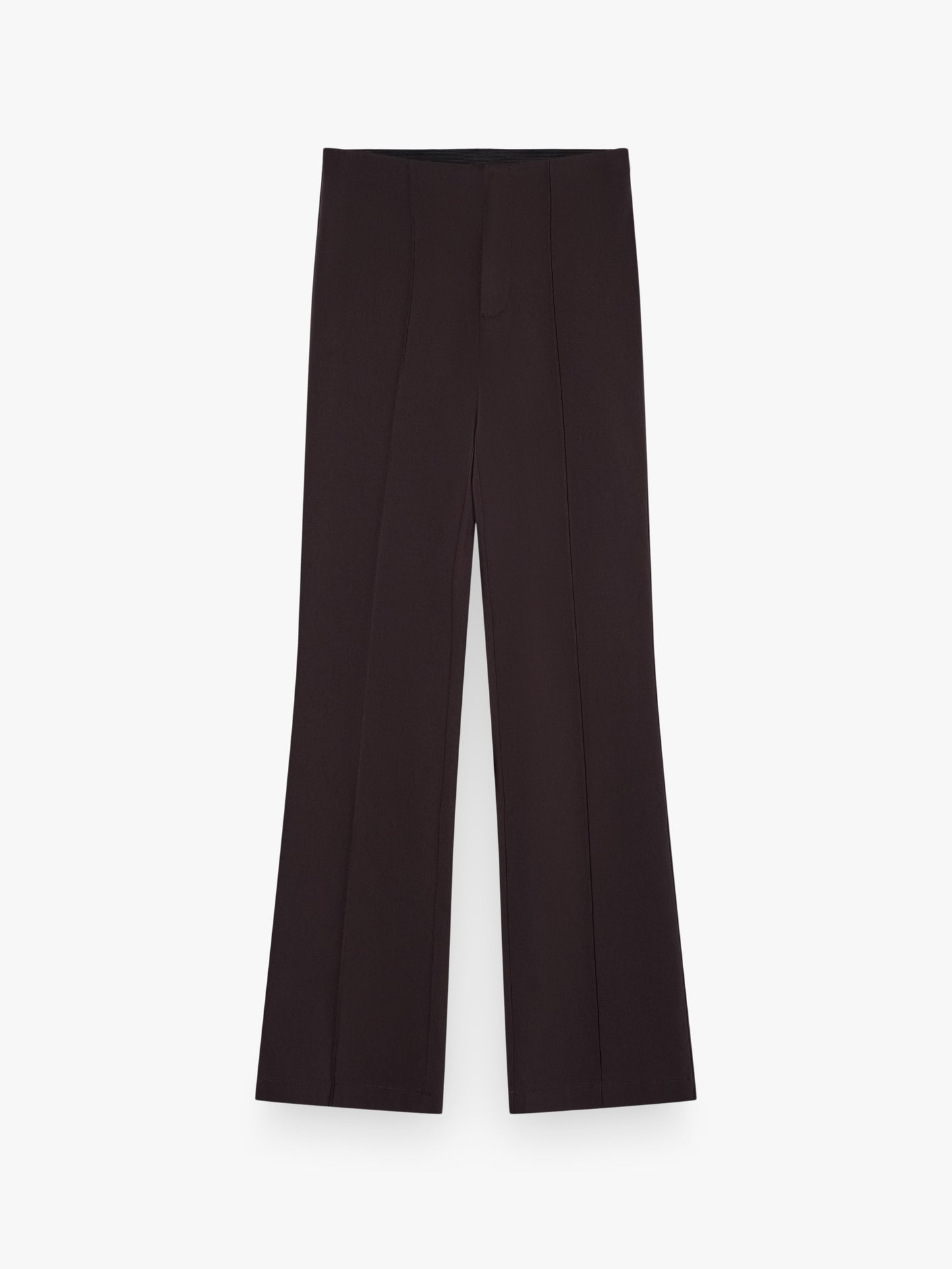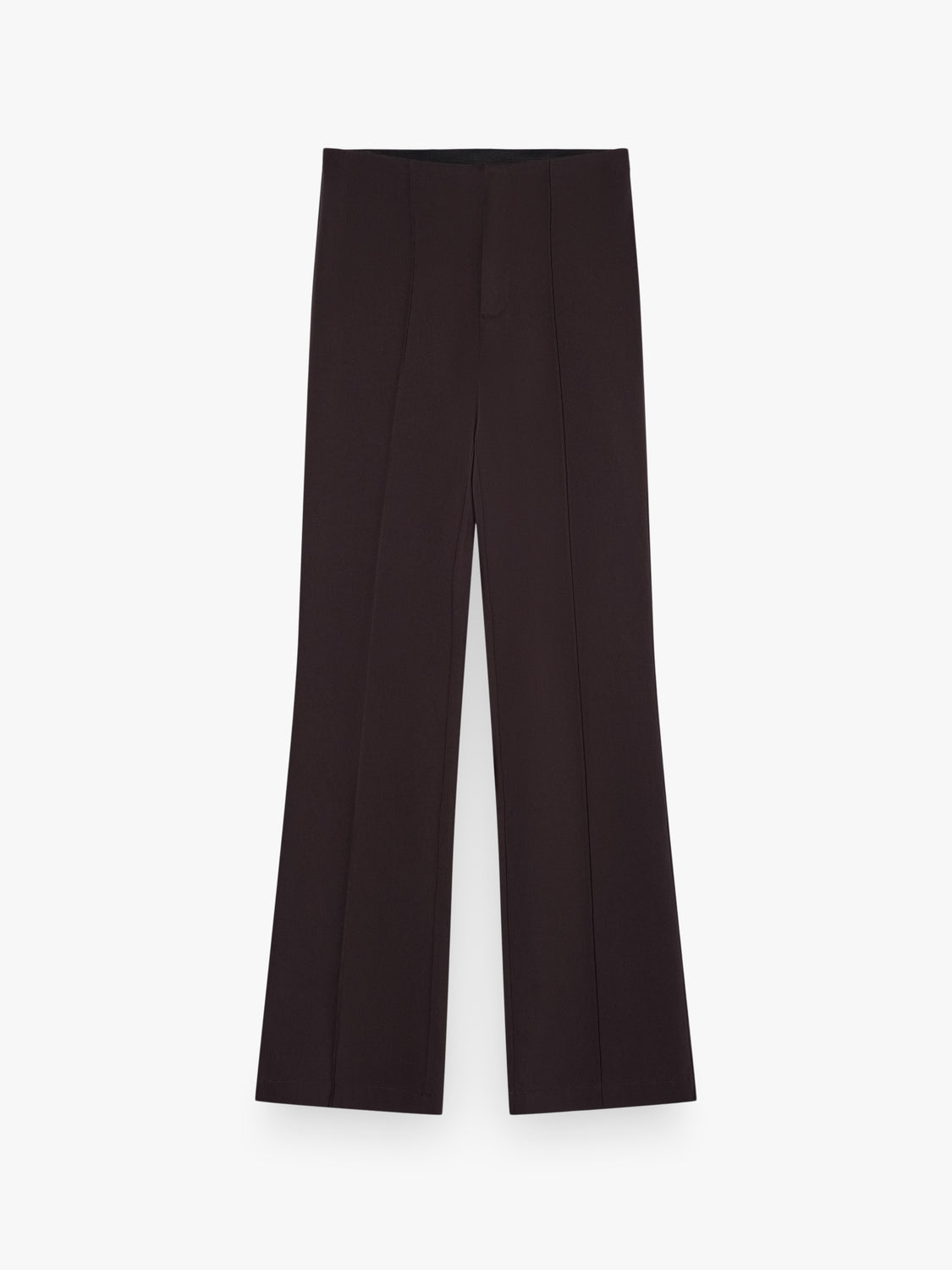 Pantalón de tiro medio con corte flare. Confeccionado en tejido elástico, presenta costura central y ligera abertura en el bajo. Cierre frontal oculto.
