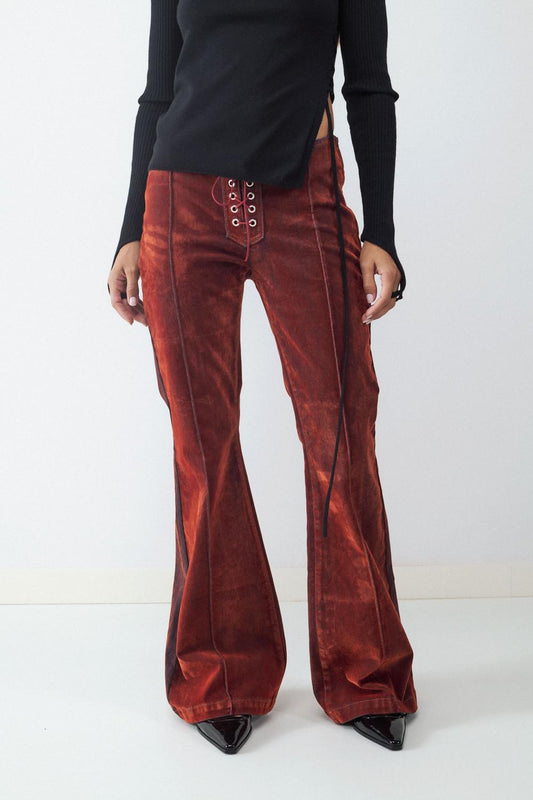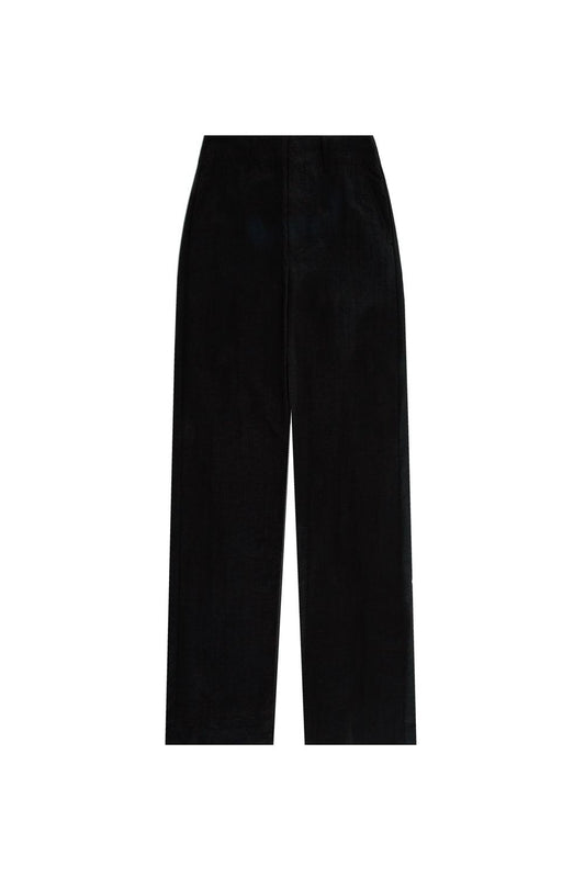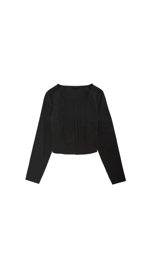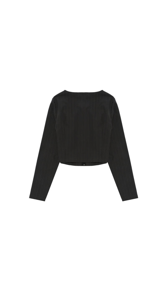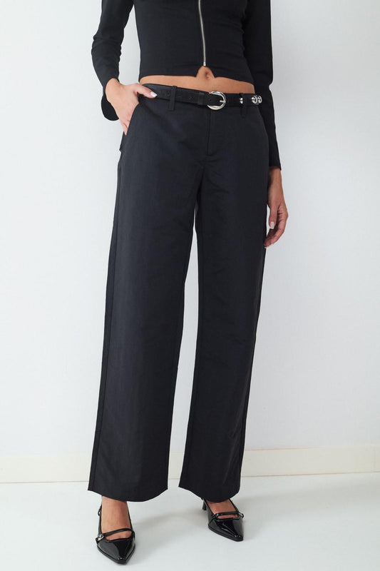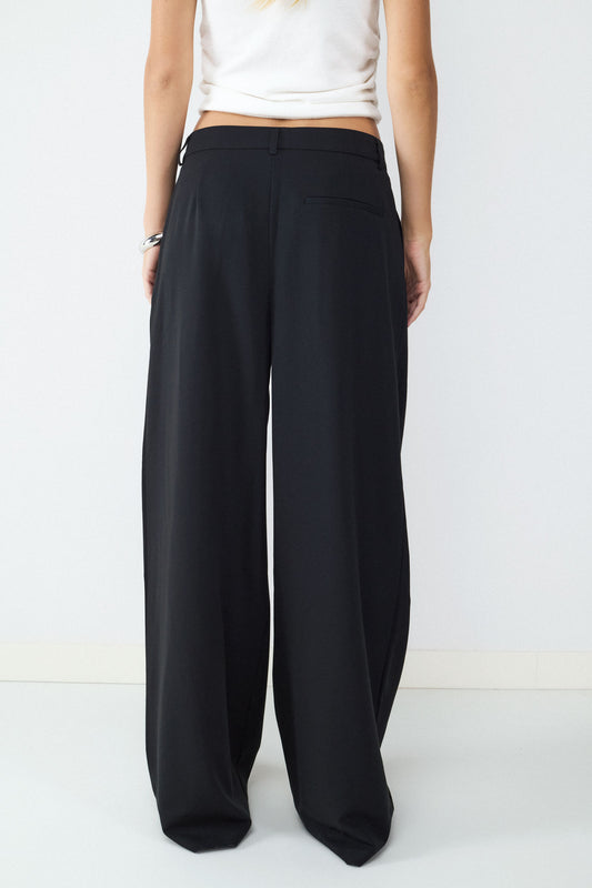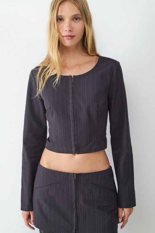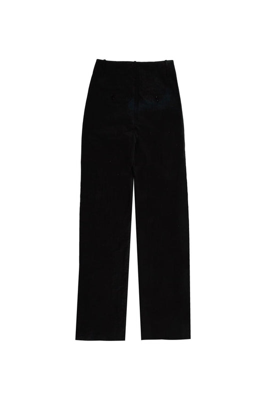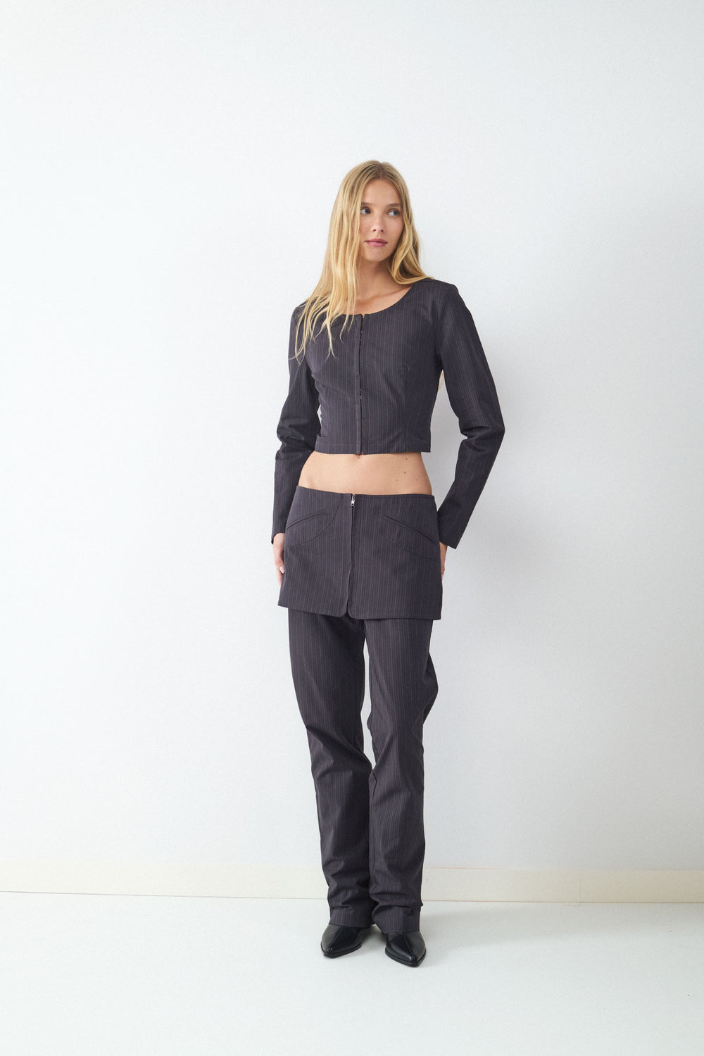 Pantalón recto rayas diplomática de tiro bajo. Cremallera frontal y detalles decorativos en la parte trasera.