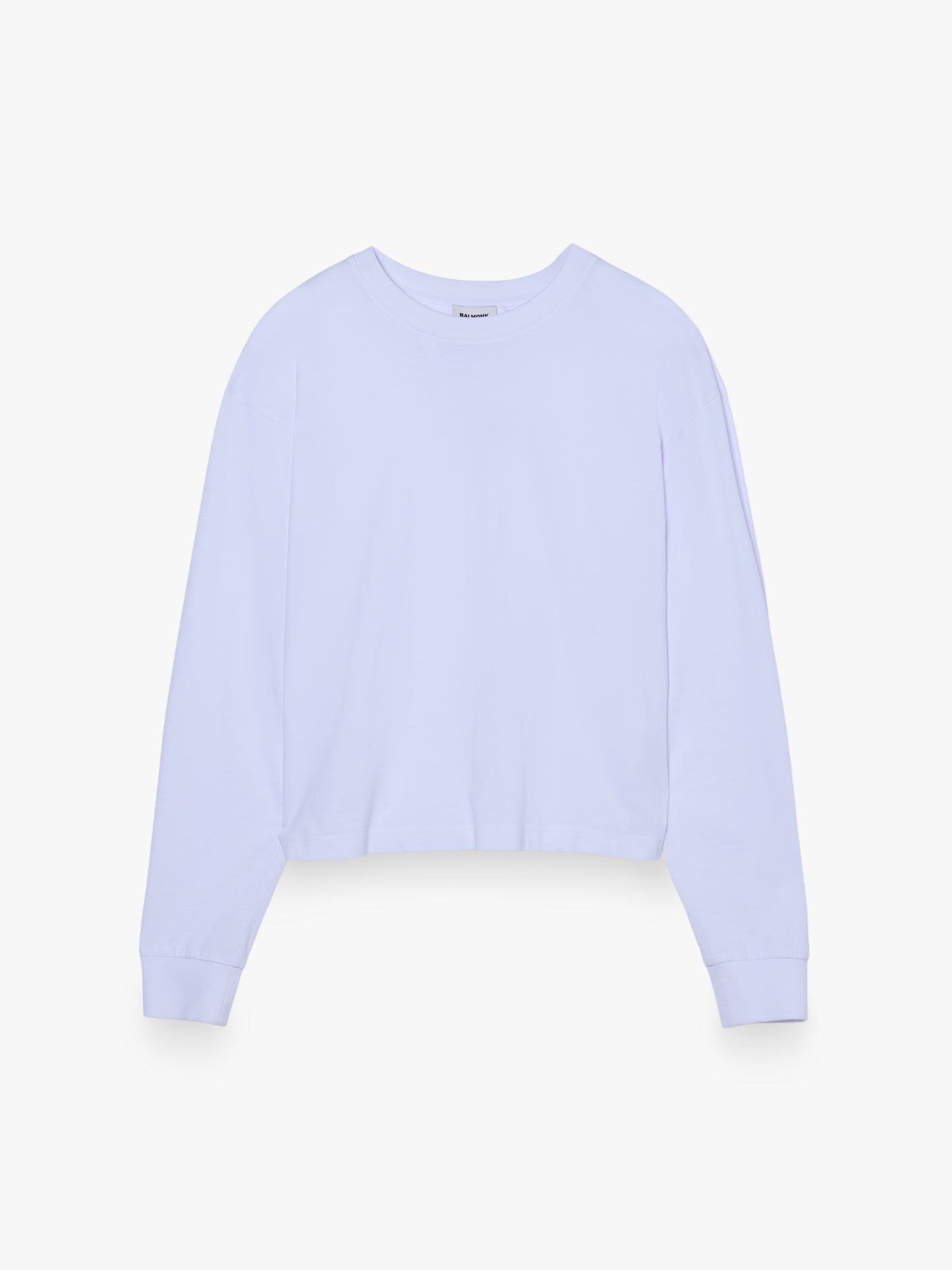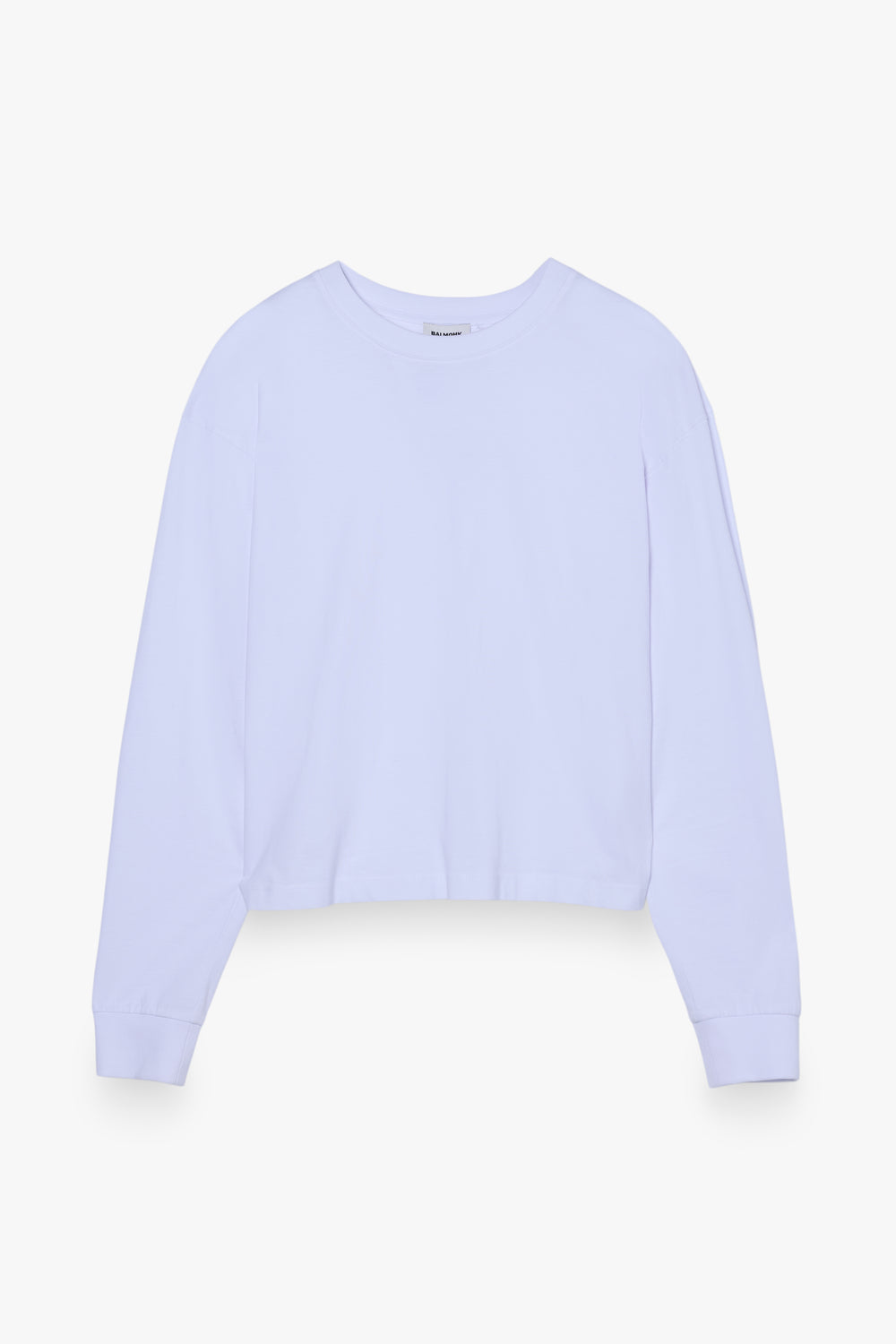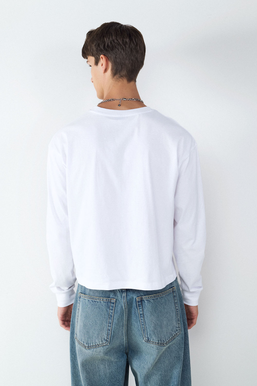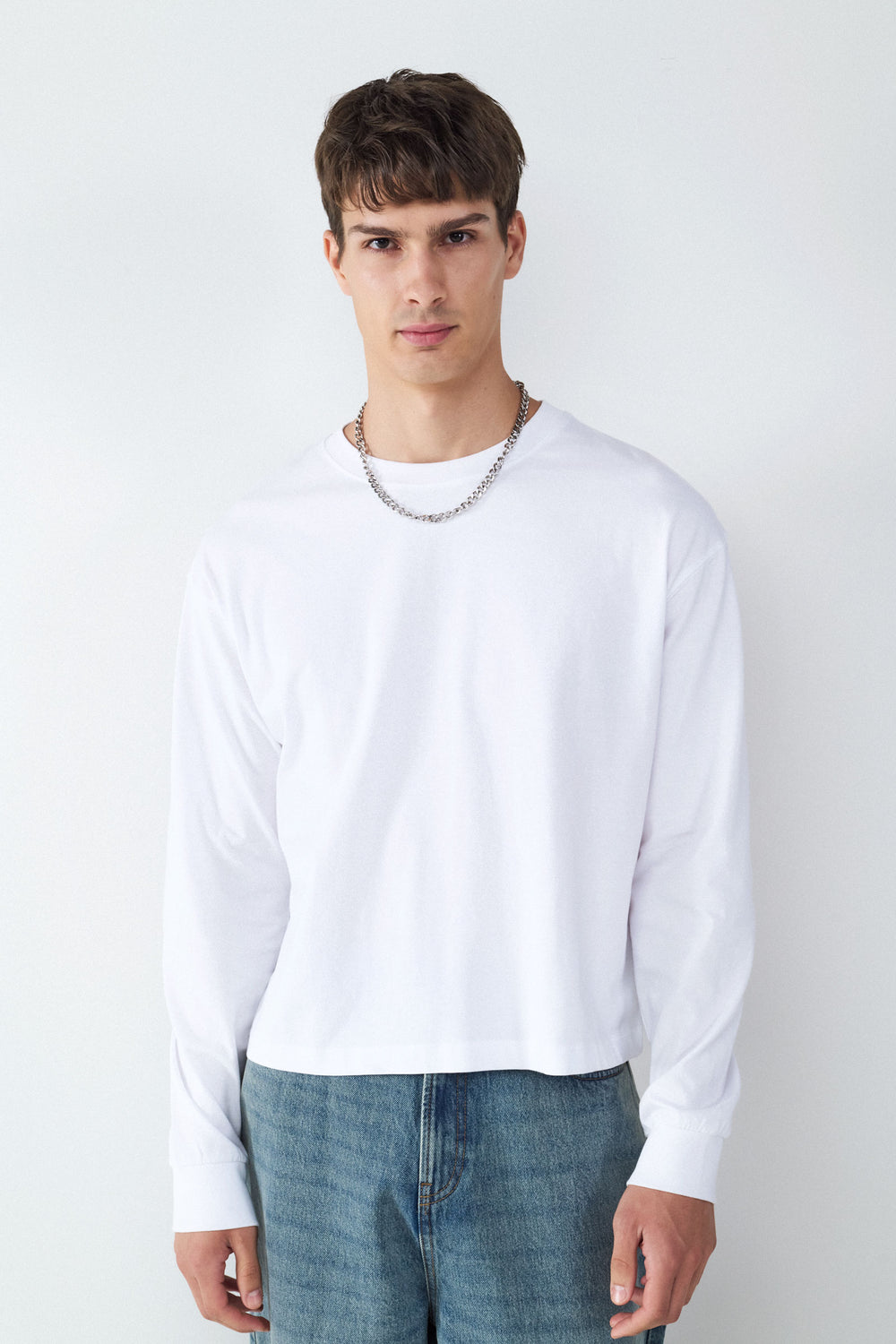 Camiseta de manga larga con corte boxy y cuello redondo, confeccionada en 100% algodón . Su silueta holgada aporta un estilo moderno y desenfadado, ideal para looks urbanos y relajados. Perfecta para combinar con jeans o pantalones cargo.