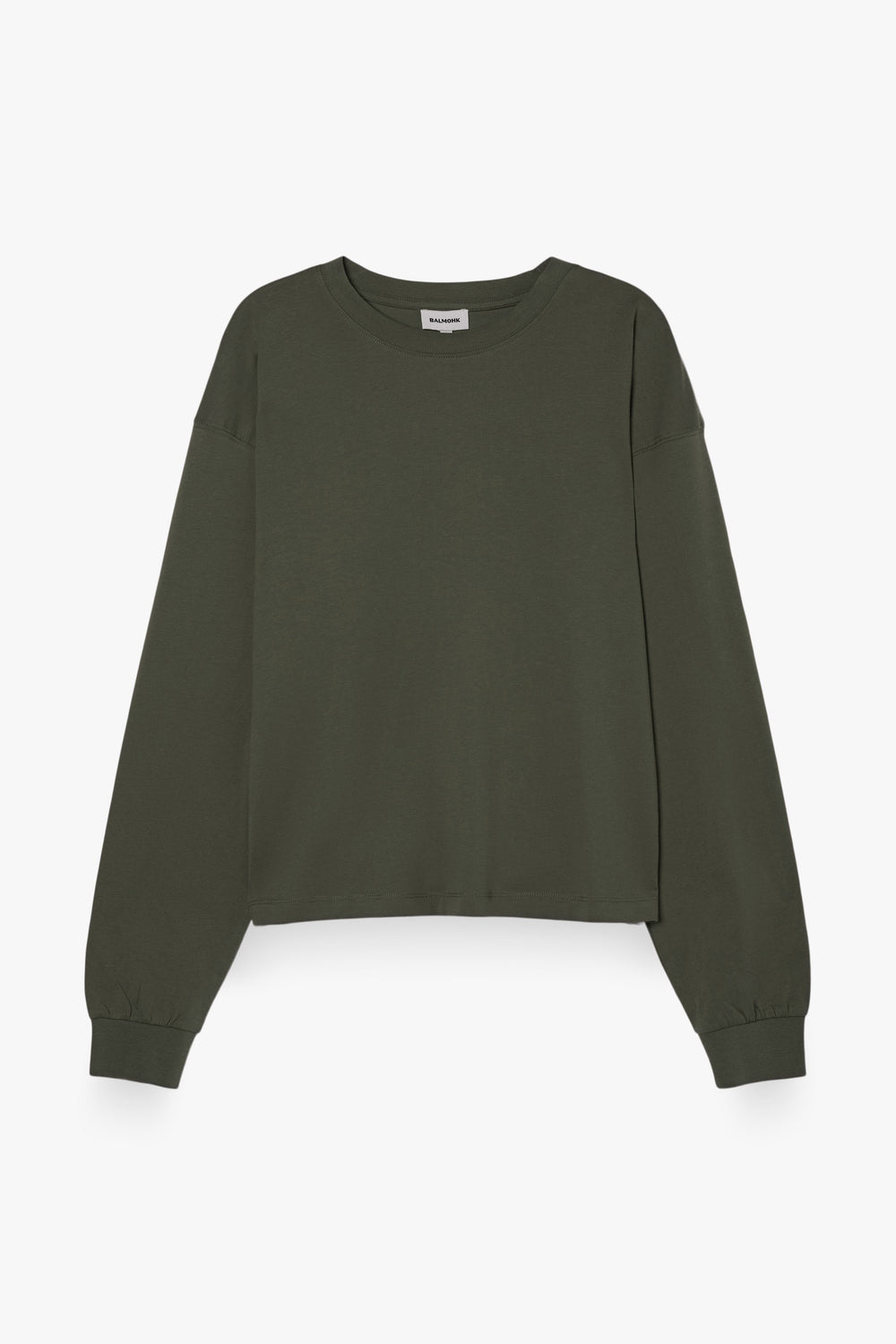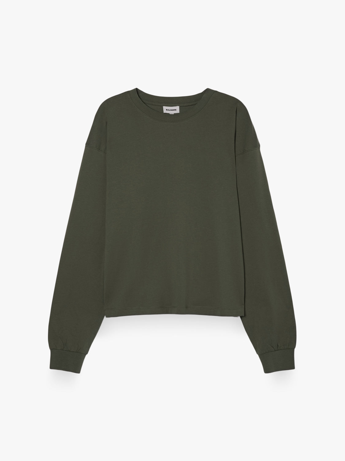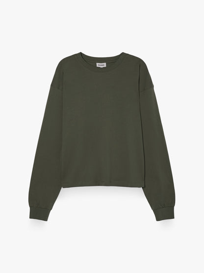 Camiseta básica de corte relaxed y mangas largas, confeccionada en tejido 100% algodón. Ideal para un look casual y cómodo en cualquier temporada. Su diseño versátil la convierte en una prenda esencial para el día a día.